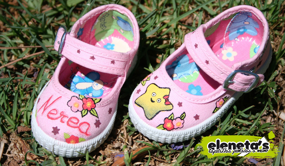 El diseño está basado en los dibujos de canciones infantiles Little Baby Bum, por eso pusimos la estrella bien visible en una de las zapatillas y en la otra personalizada con el nombre. Como siempre pintadas a mano, como todas las Eleneta’s que hemos ido haciendo.