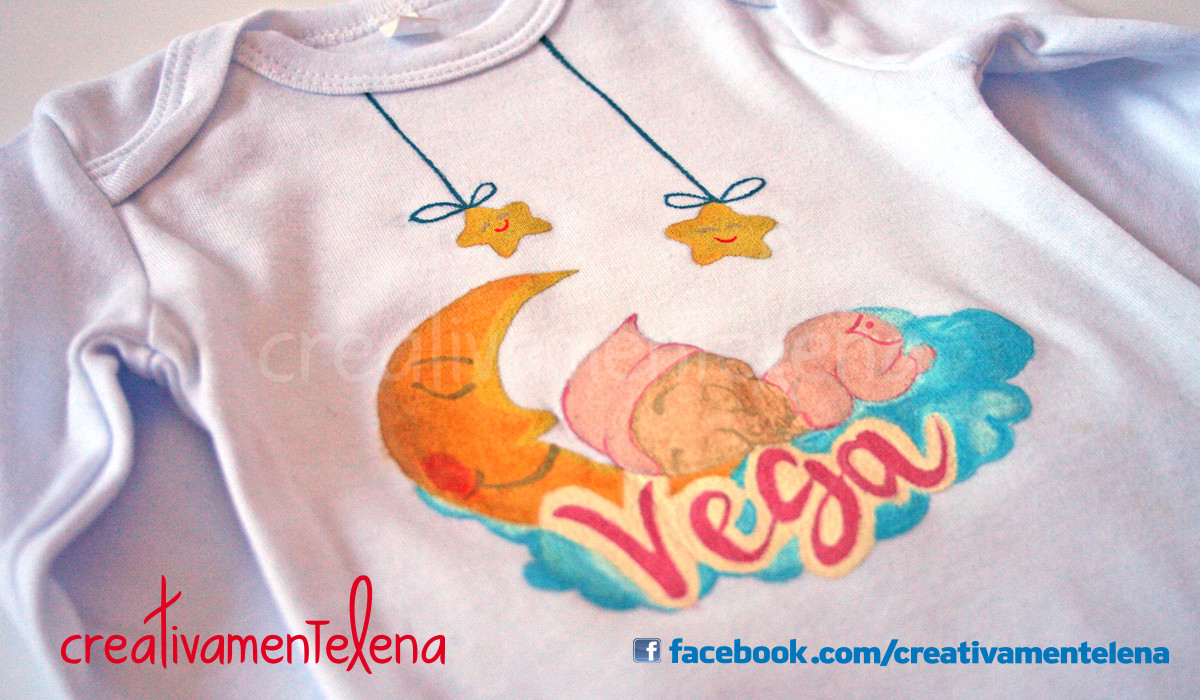 Este post es muy especial, ya que empezamos a pintar antes que naciera Vega, teníamos claro que queríamos que fuera un regalo muy especial, que no fuera un regalo más entre todos los que le iban a hacer. Así que nos pusimos manos a la obra, y diseñamos lo que después pudimos plasmar sobre un cojín, el cual confeccionamos nosotros mismos, unas zapatillas de bebe y un body, todo pintado a mano.