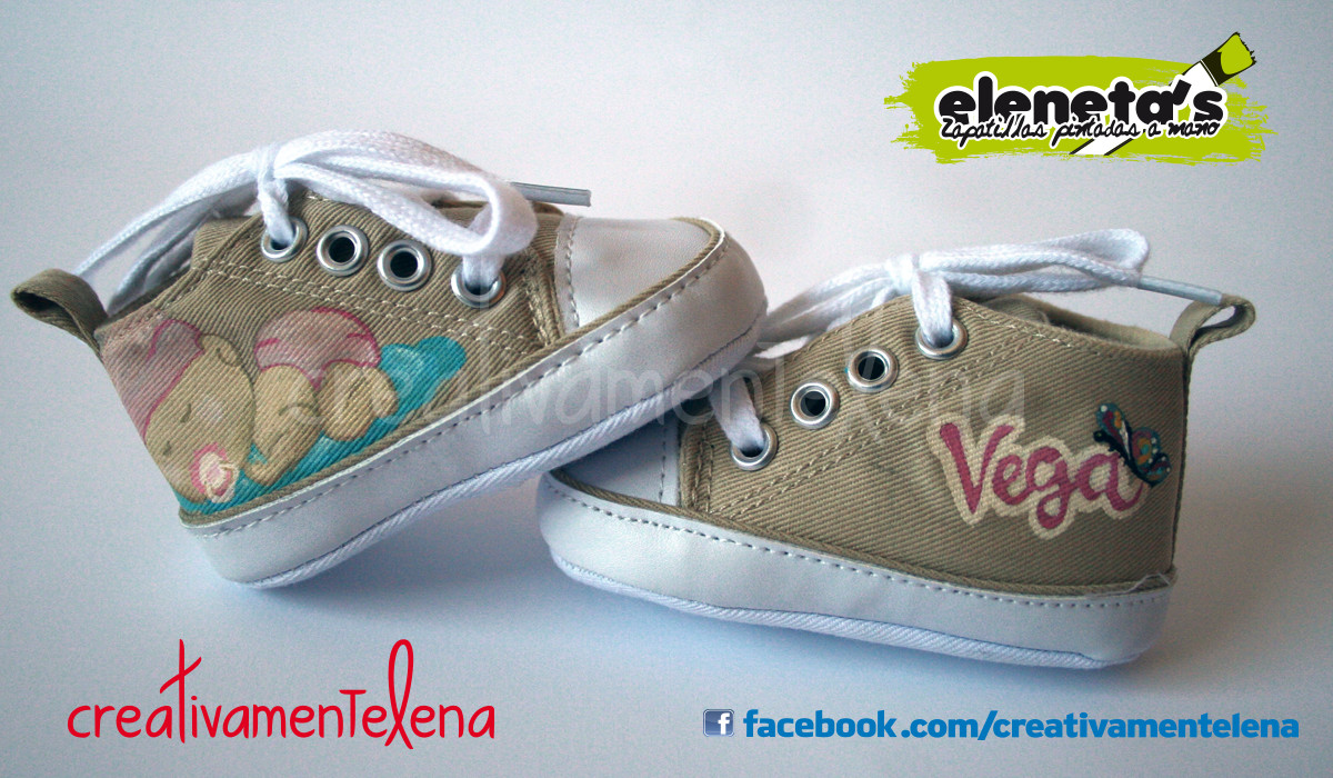 | Eleneta’s personalizadas para Vega, con detalle del nombre a un lado con una mariposa, y el dibujo de un bebe en la otra. |