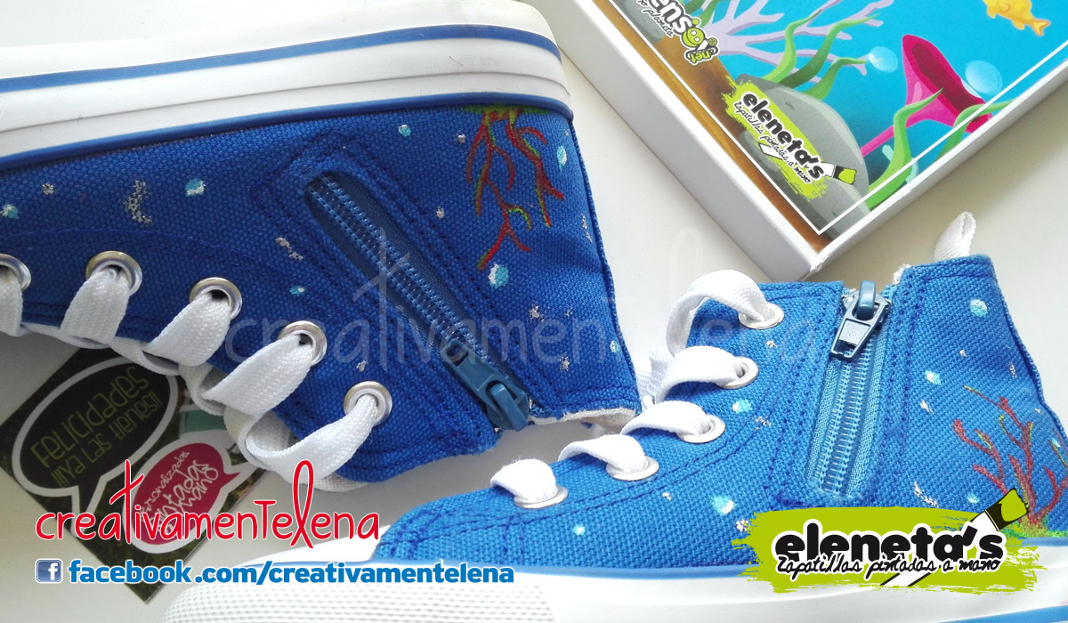 Las zapatillas estan personalizadas con dibujos relacionados con el mar, con unos cuantos peces, estrellas y caballitos de mar, y muchas burbujas.